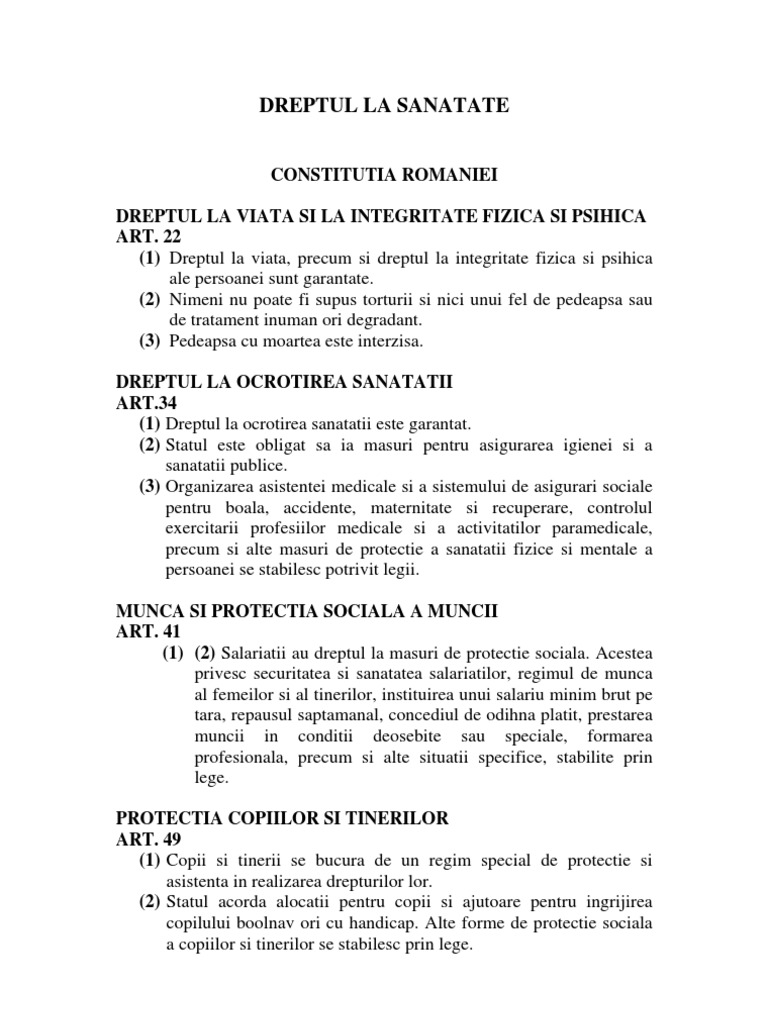 Dreptul la sanatate este unul dintre cele mai esentiale drepturi de care ne bucuram pe tot parcursul vietii noastre. Dreptul inalienabil la viata, libertate si fericire (inalienable rights to life, liberty, and the pursuit of happiness ). 46/21 ianuarie 2003 privind drepturile pacientului art.